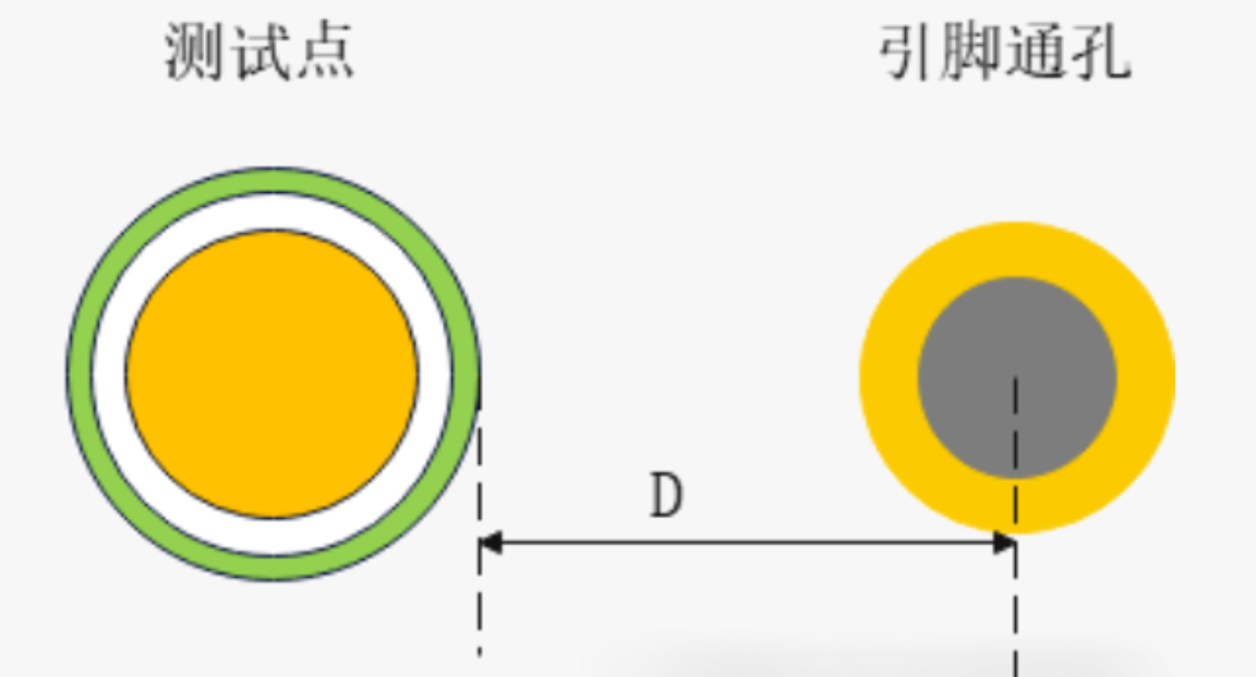 最小间距D为125mil:这是测试点和引脚通孔之间的最小可接受间隙。这个间隙是为了确保测试点和引脚通孔之间有足够的空间,以避免它们彼此接触或发生短路。