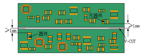 ②对于需要机器自动分板的PCB,V-CUT线两面(TOP和BOTTOM面)要求各保留不小于1mm的元器件禁布区,以避免在自动分板时损坏元器件。如下图。(元器件与V-CUT跟5.3.7冲突)