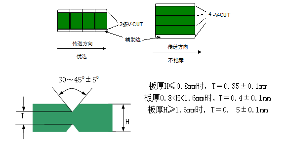 ①拼板的PCB厚度应≤3.5mm。平行传送方向的V形槽线数量≤3(对于细长的单板可以例外)。不规则拼板需采用铣槽加V-CUT方式时,铣槽间距应≥2.0mm。双面对刻V形槽—开槽或连接的厚度为板厚的1/3,误差为±0.15mm;角度为30°/45°±5°。上下刀对位精度偏差:±0.076mm。如下图。