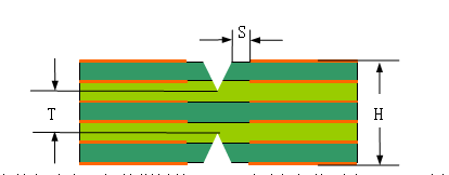 ④需考虑到V-CUT的边缘到线路(或PAD)边缘的安全距离“S”,以防止线路损伤或露铜,一般要求S≥0.3mm。如下图所示。