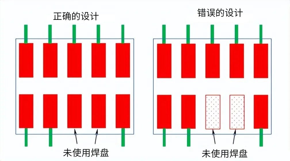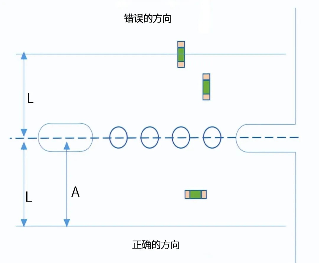 靠近PCB边界的元件必须与板轮廓平行 (这将导致元件承受来自拆板的均匀机械应力;例如,下图中左侧的元件可能会从焊盘上脱落,由于承受非均匀机械应力而导致的脱板) -