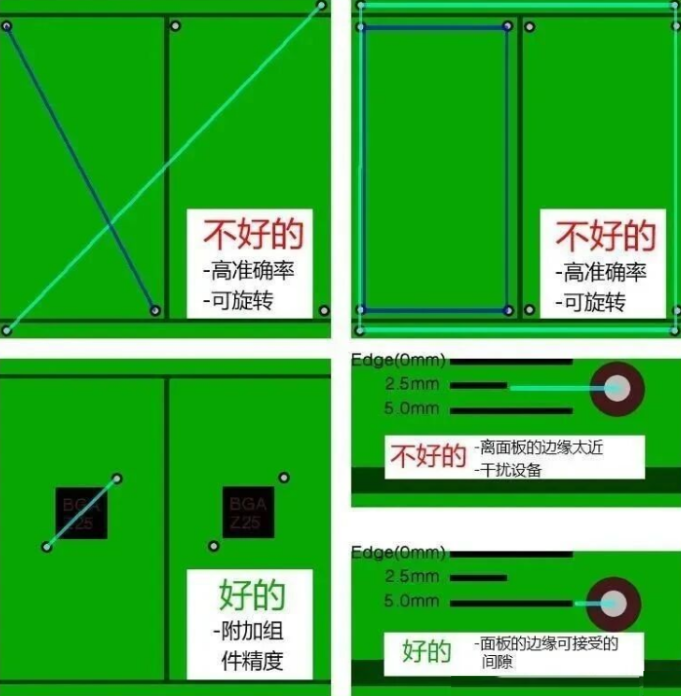 ●对边过程中,mark点 不能定位在夹边到边4mm 范围内。PCB mark点 位置应沿对角线放置,并且它们之间的距离应尽可能大。