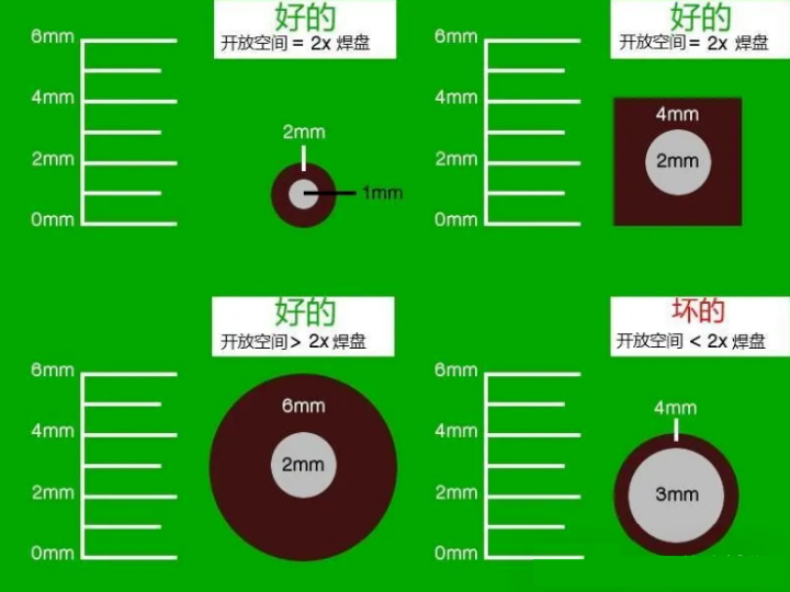开放空间的直径应至少是焊盘尺寸的两倍。因此,对于 2mm 的焊盘,你需要在其周围至少留出 4mm 的间隙区域。间隙区域的形状不太重要;圆形和方形区域是两种流行的设计。