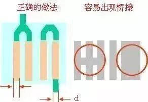如果相邻的焊盘需要相连,首先确认在外面进行连接,防止连成一团造成桥接,同时注意此时的铜线的宽度。