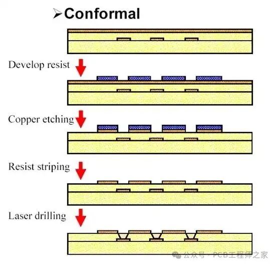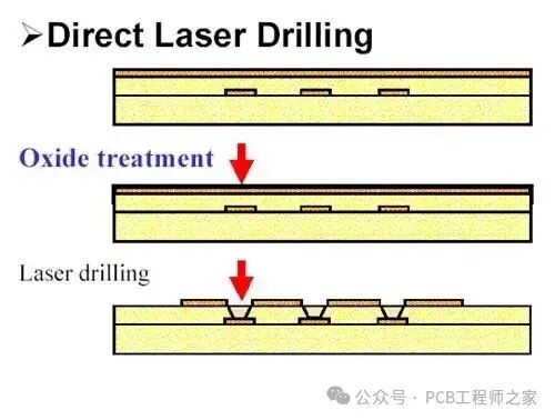 先以内层标靶定位,UV镭射用高能量直接将外层铜打掉,然后再用低能量将残余树脂清除.