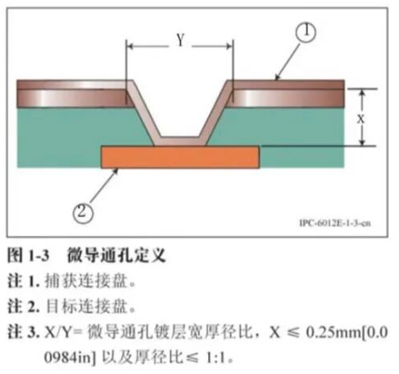 微导通孔 按照图1-3测量时,最大厚径比为1:1,终止在或穿过目标连接盘的,从其捕获连接盘箔到目标连接盘的距离(X)不超过0.25mm[0.00984in]的盲孔结构(电镀态的)。